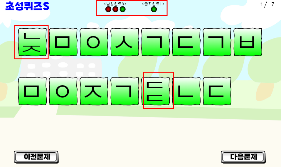 1단계 힌트를 누르면 받침이 있는 글자는 받침까지 보여지게 된다.