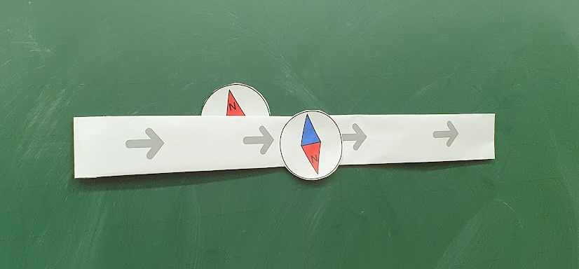 수업 시간에 전류가 흐르는 도선 주위에 생기는 자기장을 설명하다 보니 학생들이 생각보다 어려워한다. 그래서 좀 더 쉽게 설명하기 위해서 나침반과 도선을 칠판에 붙여가며 설명하기로 했다.