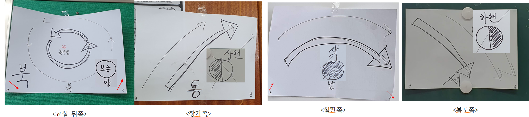 (처음에는 칠판앞에 북쪽을 붙여 주었는데, 지금은 교실 뒤쪽 맨위에 북쪽을 표시해 준다. 이유는 학생들에게 선생님 얼굴이 태양이라고 강조 하는데, 태양은 남쪽에 있기 때문이다)