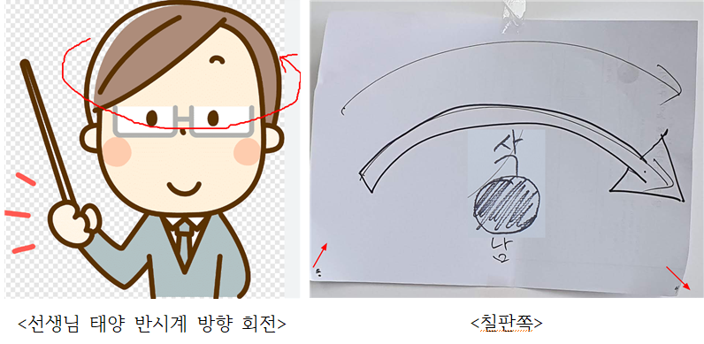 뒤로 돌아서 북극성을 보면서 동에서 서로 손가락으로 그려보면 북극성을 중심으로 반시계 방향으로 회전한다는 것을 알 수 있다. 그럼 선생님 얼굴(태양)을 바라 보면서 동에서 서로 손가락으로 그려보면 태양은 시계방향으로 이동하는 걸 알 수 있다.