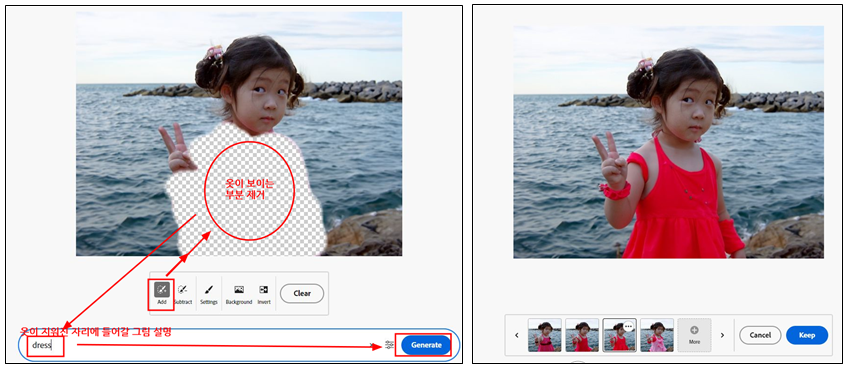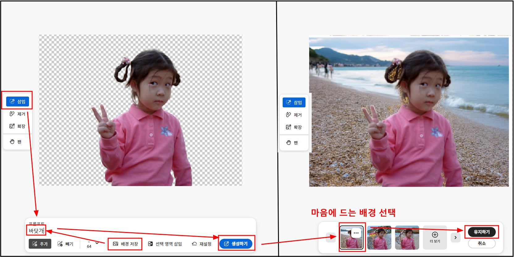 그럼 왼쪽에 '삽입'을 선택하고 프롬프트에 '바닷가' 라고 입력하고 '생성하기' 버튼을 누르면 지워진 배경자리가 바다 배경으로 바뀐다. 바다 배경이 아래쪽에 여러개 생성된다. 그 중에 마음에 드는 걸 선택하면 된다.