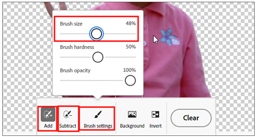 - 인공지능이 배경을 정말 잘 알아서 제거해 준다. 만약 제대로 제거되지 않는다면, 브러시 아이콘을 선택하고 Add를 눌러 추가로 배경이 될 부분을 지우거나, Subtract를 눌러 배경이 아닌데도 지워진 부분을 복원할 수 있다.