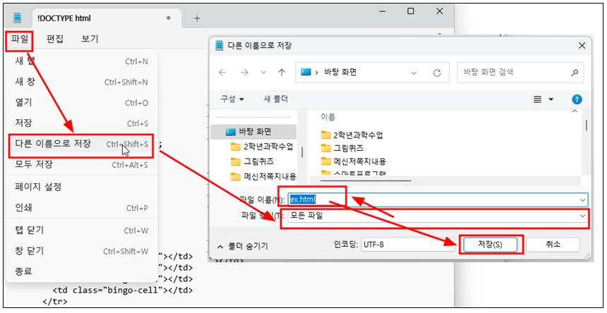 다. 파일 – 다른이름으로 저장하기를 누르고 파일형식을 모든파일로 선택하고, 파일이름 뒤에 .html을 붙여서 저장하면 된다. ex.html 파일로 바탕화면에 저장해 보았다.