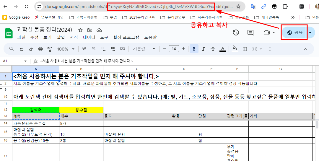 3. 그리고 과학실 물품 검색용 구글스프레드시트만 공유해 주면, 원본을 회손하지 않고, 검색만 가능하게 할 수 있다.