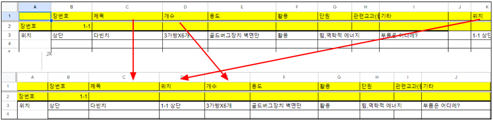 입력 형식은 자신의 학교에 맞게 수정해서 사용해도 된다. 아래 그림처럼 제목 다음에 위치를 적어도 된다. 단 C열부터 검색이 되기 때문에, 형식을 바꾸더라도 C열 이후에 중요한 내용이 들어가게 만들자.