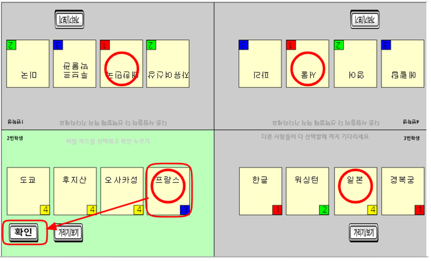 (위 그림에서 2번 학생의 경우 일본과 관련된 카드가 많으니까, 프랑스 카드를 선택해서 버릴 예정이다. 프랑스 카드를 선택하고 확인을 누르면 프랑스 카드는 다른 사람에게 가고, 다른 사람들이 버린 카드 즉 대한민국, 서울, 일본 카드 중에 1개가 임의로 2번 학생에게 오게 된다.