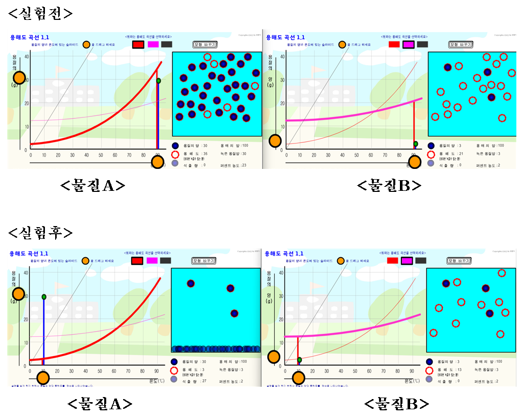 재결정 설명을 할 때 용해도 곡선 가상실험 프로그램을 화면 양쪽에 2개 띄워 놓고 설명을 하면 편하다.