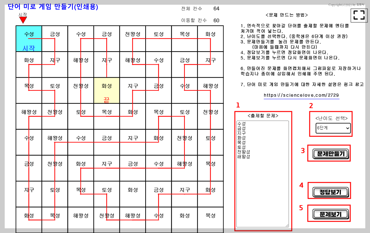 단어 미로 게임 만들기 아래 링크에 접속해서 만들면 된다. https://sciencej.cafe24.com/html5/danmiro/danmiromaker.html 1. 원하는 단어를 한줄에 하나씩 순서대로 입력한다. 단어 길이는 최대 8글자(영어는16글