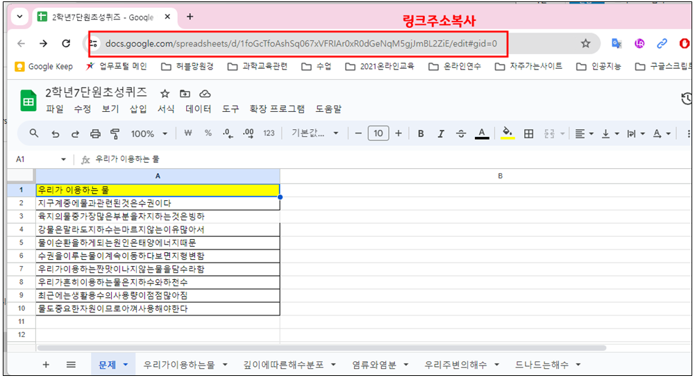 구글 스프레드시트를 만들고 나면 링크주소를 복사해 가야 한다. 이때는 반드시 구글 스프레드시트를 누구나 읽을 수 있게 공유해 두어야 정상적으로 문제를 가져올 수 있다.
