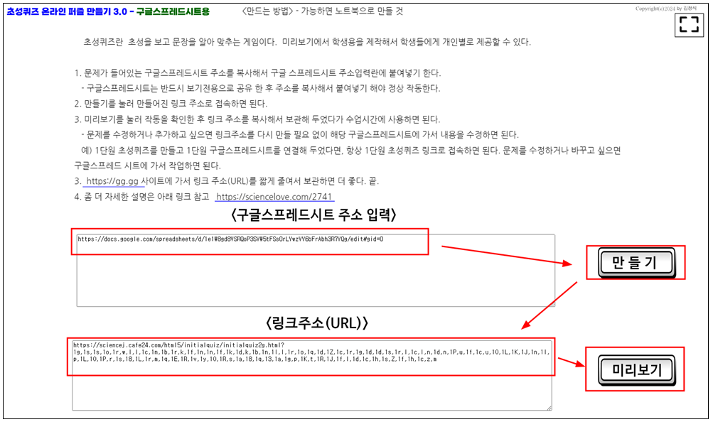 만들기 버튼을 누르면 링크주소(URL)에 초성퀴즈 링크주소가 생긴다.
