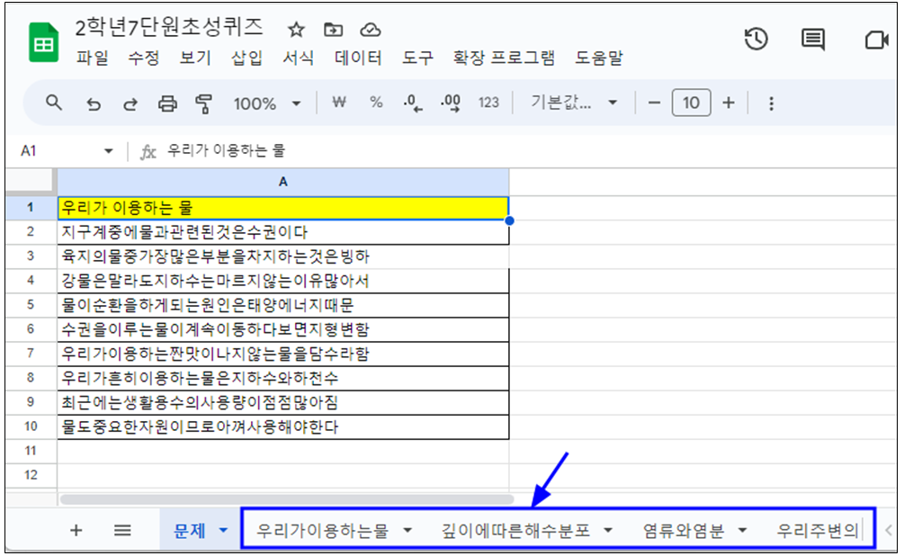 <초성퀴즈 만드는 방법> - 먼저 구글 스프레드시트에 문제 입력