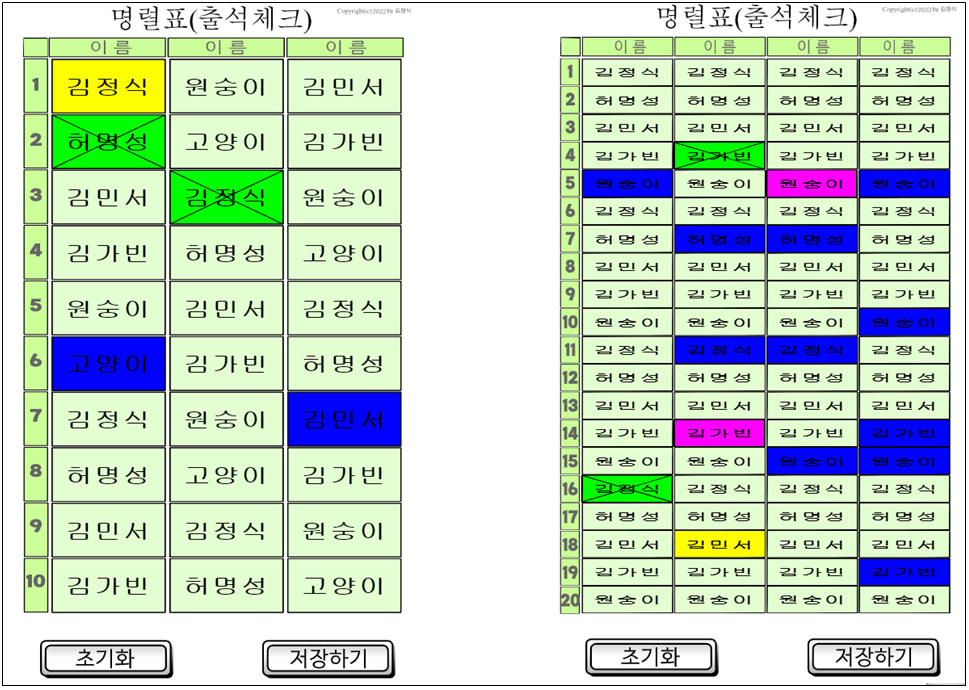 쉬운사용법에 중점을 두었습니다. 우선은 1반에 이름만 엔터를 쳐가면서 3-4명 입력해 보세요. 그럼 어떻게 작동하는지 알 수 있어요. 체크한 것은 자동 저장입니다. 일단 활용방법을 먼저 보세