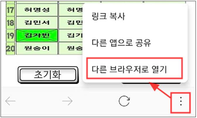 카톡으로 받아서 링크를 실행하면 카톡 브라우저에서 링크주소가 열린다. 이런 경우에는 아래 점 3개 메뉴를 눌러 다른 브라우저로 열기를 선택하면 크롬 브라우저에서 열 수 있다.