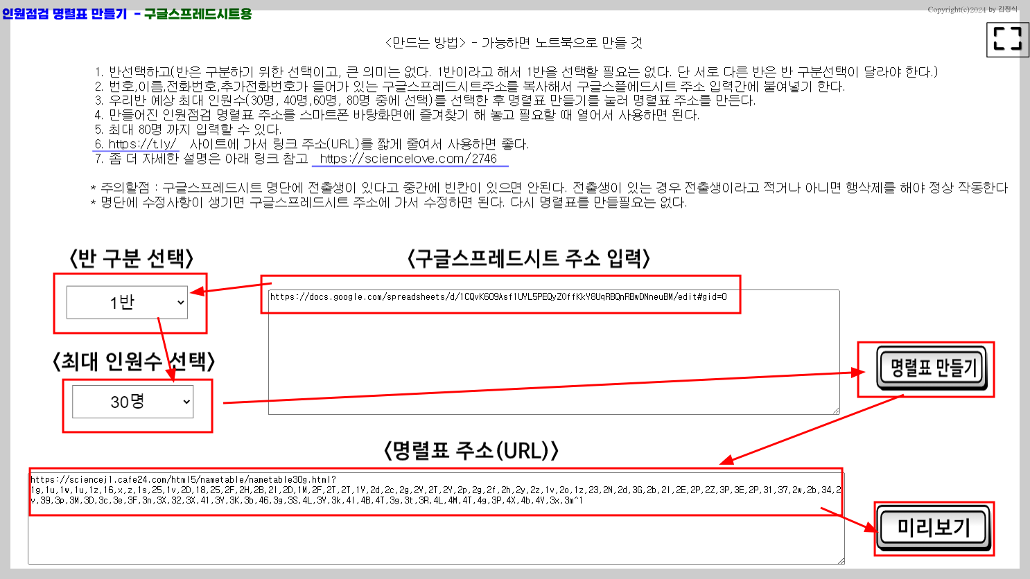다. 아래 인원점검 명렬표 만들기 링크에 접속해서 구글스프레드시트 링크주소를 붙여 넣고 인원점검 명렬표를 만들면 된다.