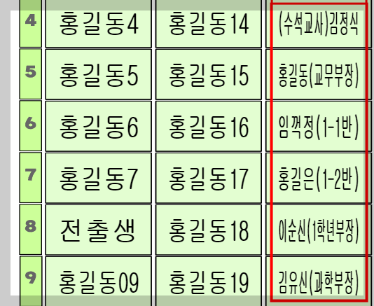 인원점검 명렬표2025에서는 긴 이름이나 부서명이 포함된 이름도 입력이 가능하다. 예)홍길동(과학부장) 단 이름에서 띄어쓰기를 하면 안된다.