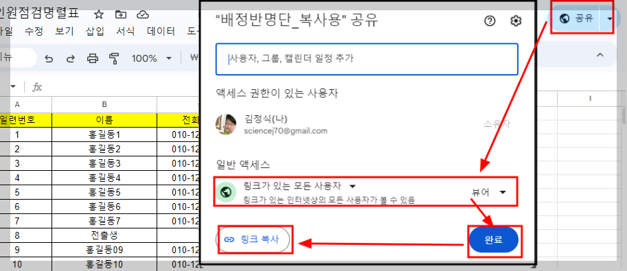 나. 완성된 명렬표 구글스프레드시트를 보기 전용으로 공유한 후, 구글스프레드시트 링크 주소를 복사한다.