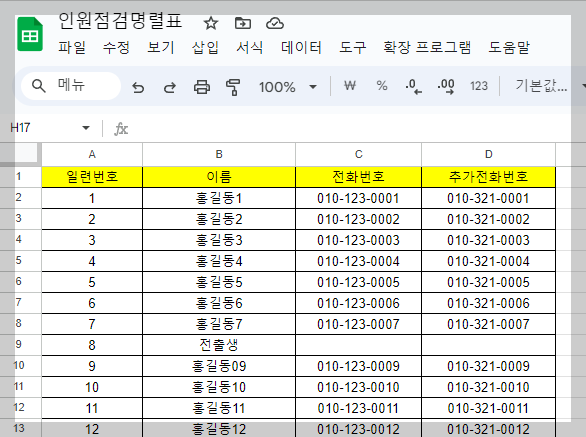 필자의 경우에는 학기 초 제일 먼저 교직원 비상연락망을 이용해서 교직원 인원점검 명렬표를 만든다. 그럼 1년 동안 편하게 사용할 수 있다. 필요한 선생님들께 공유도 가능하다.