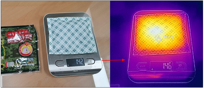 아래 사진 왼쪽은 처음 뜯었을 때의 질량이고 오른쪽 사진은 발열반응이 일어나고 있는 모습을 열화상카메라로 찍은 사진이다. 발열되면서 질량도 약간 증가한 걸 확인할 수 있다.
