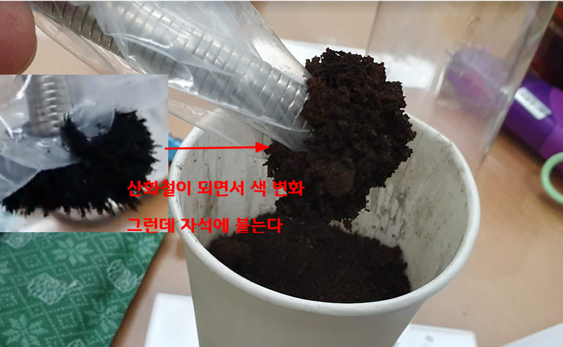 그리고 반응전에는 철가루라 자석에 잘 붙는데 반응이 끝나고 나면 산화철이 되어 자석에 처음보다 잘 달라붙지 않는것도 확인할 수 있다.