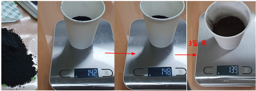 몇일 후 측정해 보니 종이컵에 뜯어 놓은 것은 질량이 오히려 감소한다.