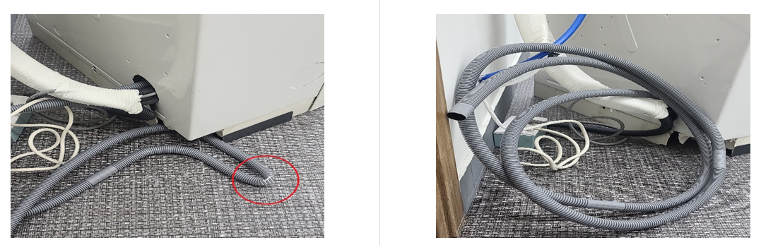 집에서 설치된 에어컨을 보면 뒤쪽에 물이 빠져나가는 배수호스가 연결된 것을 볼 수 있다. 이 배수호스가 빠지거나 파손이 되면 집안이 물바다가 되기도 한다. 이것을 증발기를 지나는 동안 응결해서 바뀐 물이 밖으로 빠져 나가지 못하기 때문이다.