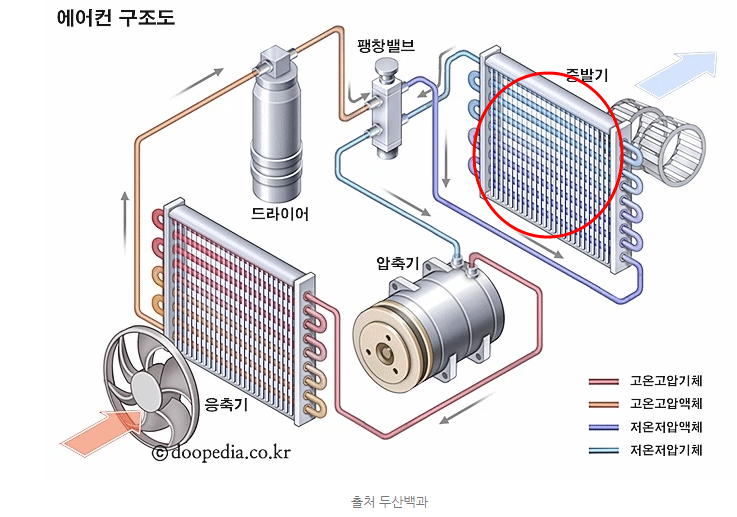 그럼 에어컨의 증발기를 지나 차내부로 들어오는 공기는 건조해 진다.