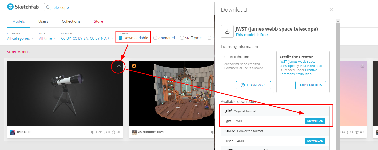 - 원하는 모델이 나오면 다운로드를 눌러 모델을 다운로드 한다. 이때 반드시 gltf 화일로 다운로드 한다.(그래야 물체의 색이 제대로 나온다)