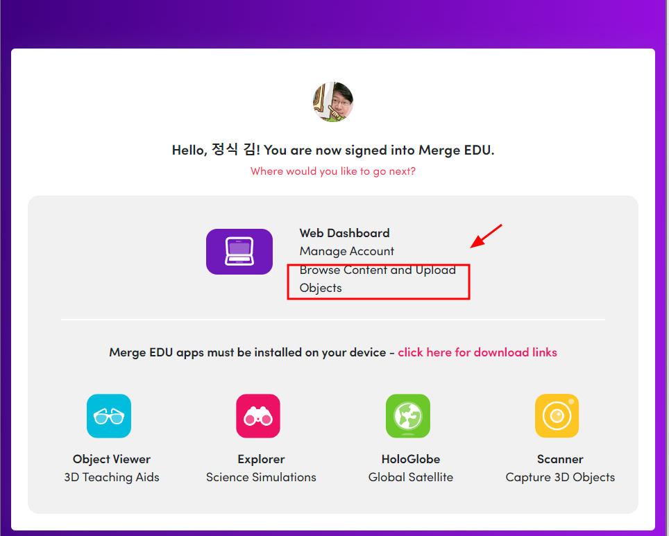 sketchfab 에서 3D 물체를 다운 받아서 merge edu 사이트에 올리고, 스마트기기에서 Object Viewer 앱으로 관찰하면 된다.