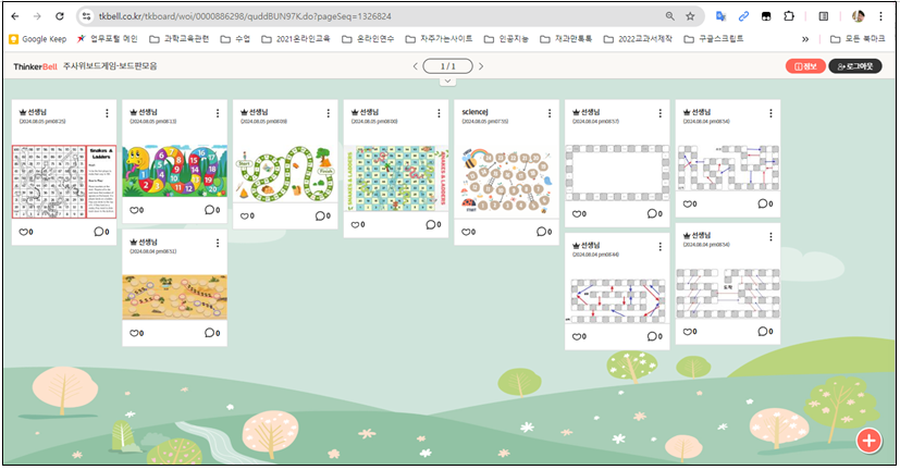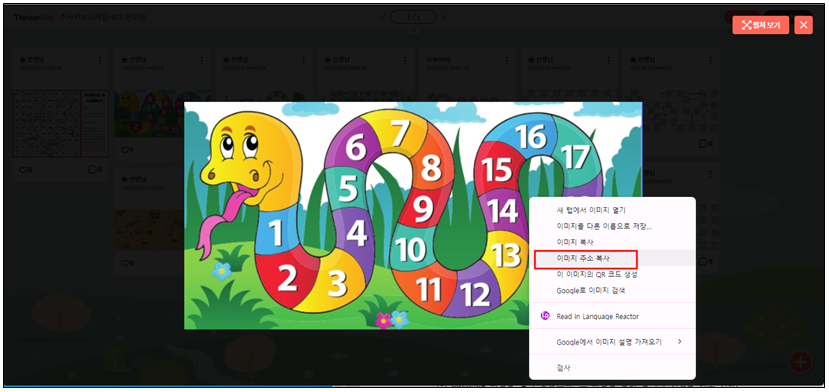 3. 학생들이 그린 보드판을 사진을 찍거나 이미지로 저장해서 띵커보드에 올리고 주사위게임만들기 프로그램에서 연결시키면 온라인에서도 학생들이 만든 보드판으로 주사위 게임을 즐길 수 있다.