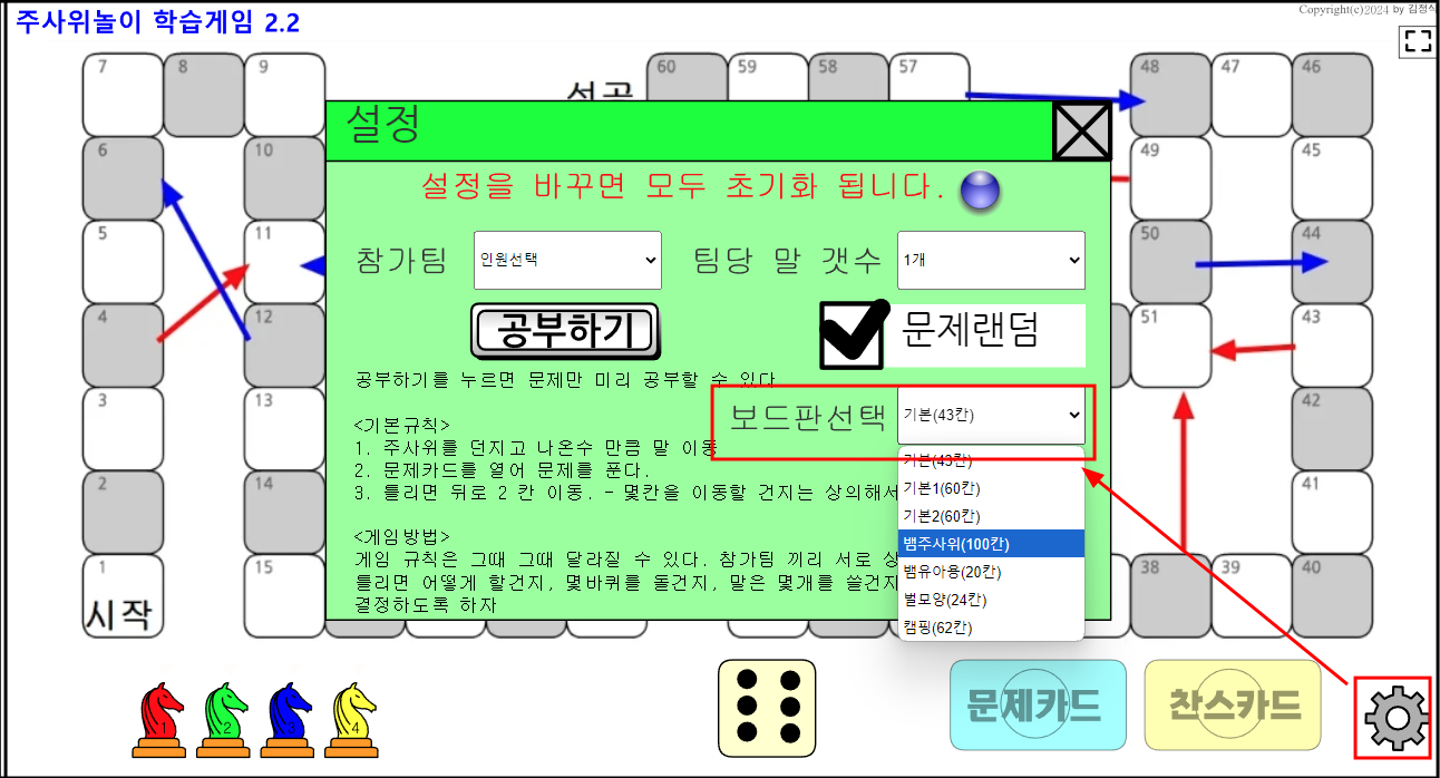 - 문제모드 선택에 체크하면, 보드게임에서 문제카드를 열때 원하는 문제 번호를 선택해서 열 수 있다.