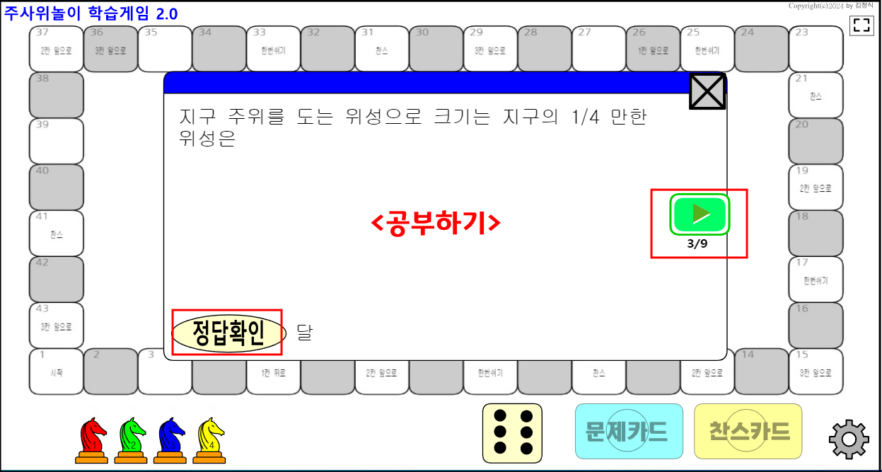 주사위를 던지고 말을 이동하고 나면, 문제카드 버튼이 활성화 된다. 문제카드를 눌러 학습과 관련된 문제를 풀면서 진행하게 하면 된다.