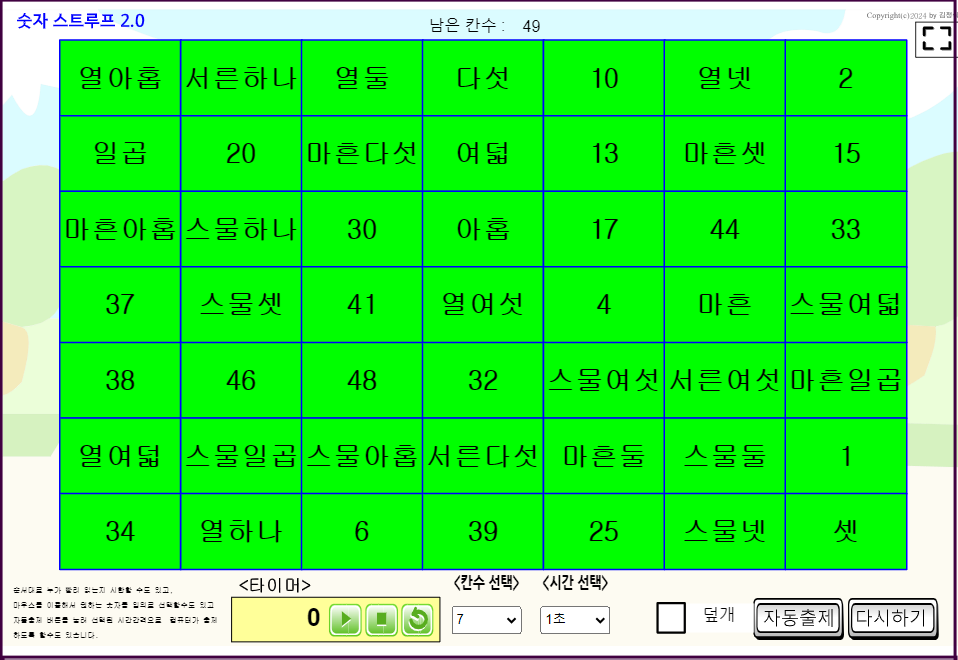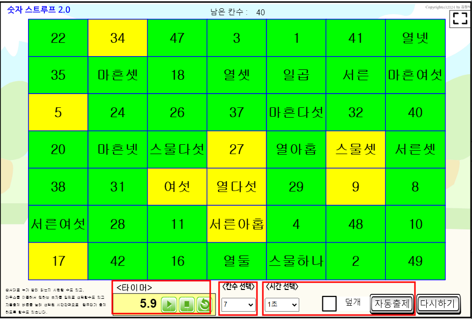 - 쉽고 빠른시간에 하려면 적은 칸수로 난이도를 높이려면 많은 칸수로 바꿔서 실행하면 된다.