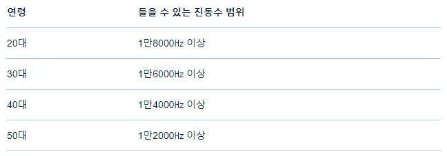 이 원리를 역으로 이용해서 늦은 저녁 공원 스피커에 17000Hz 정도의 음을 발생시키면, 늦은 저녁 공원에서 어른들은 편안하게 산책을 즐길 수 있지만,