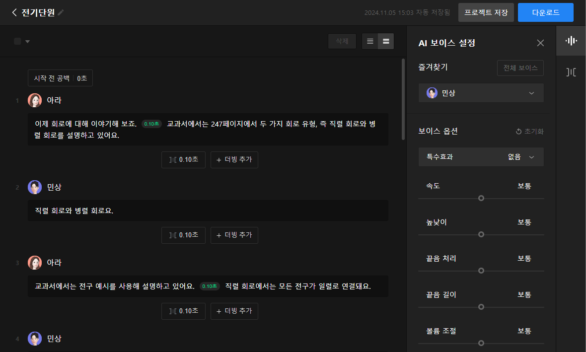 4. 클로바 더빙에 가서 한글로 대화하는 팟캐스트를 만든다.