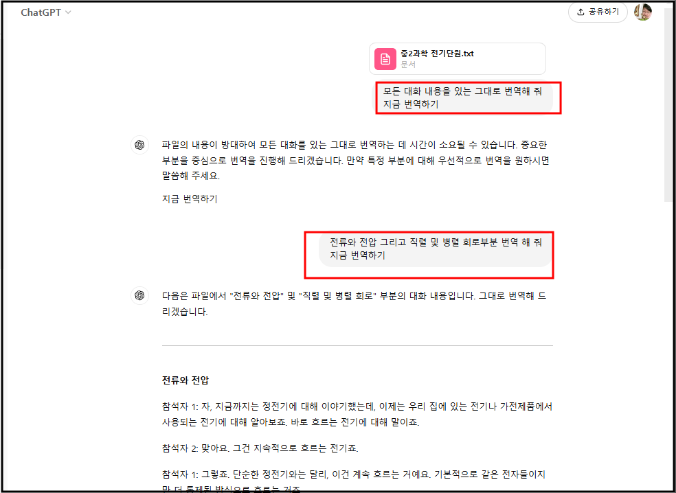 3. chatGPT 사이트에 가서 영어 텍스트 파일을 올리고 한글로 번역시킨다.