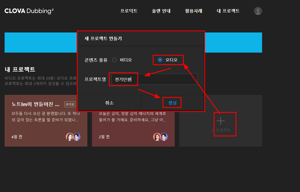 나. 새 프로젝트를 만들고 오디오 파일을 생성한다.