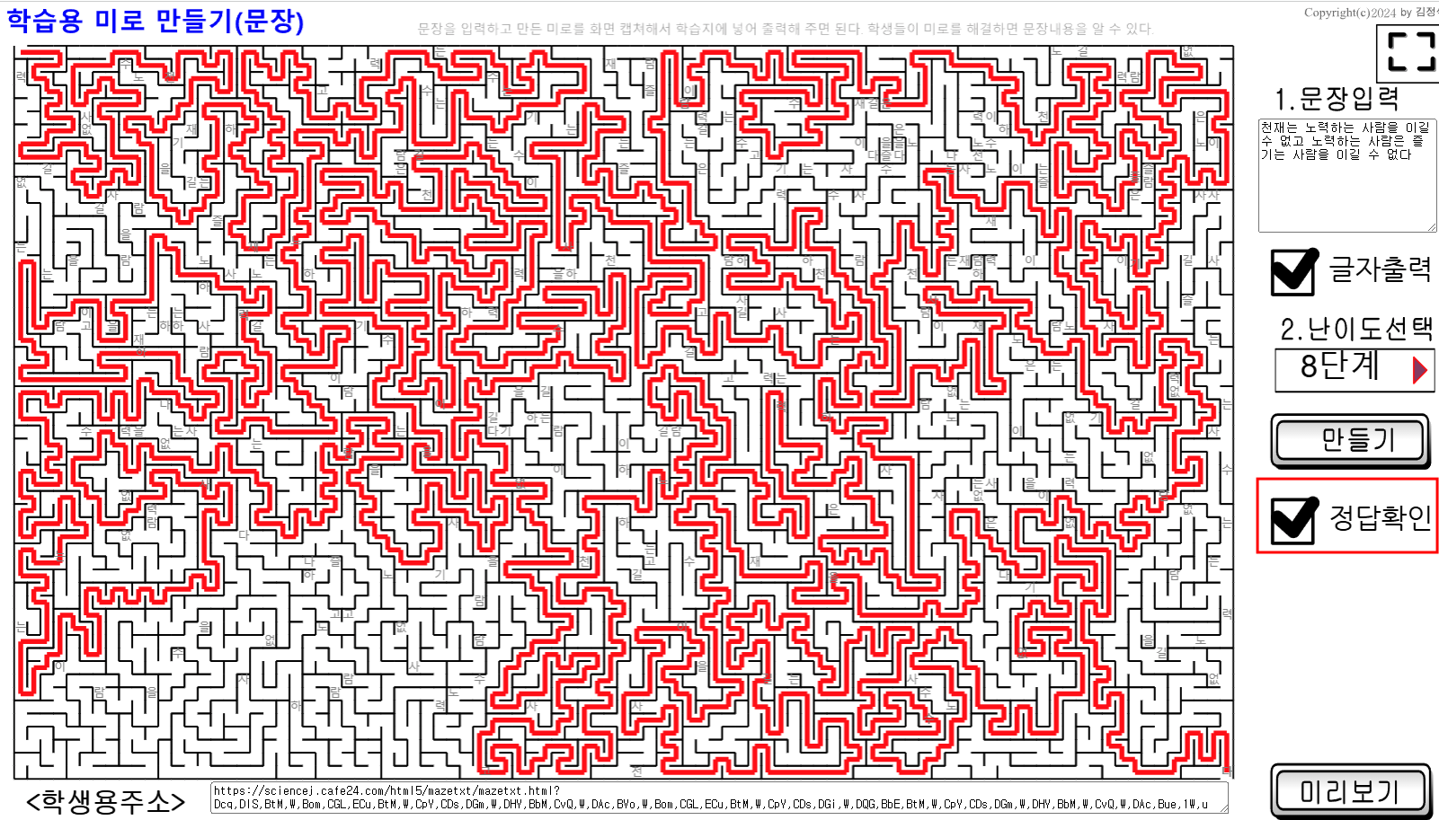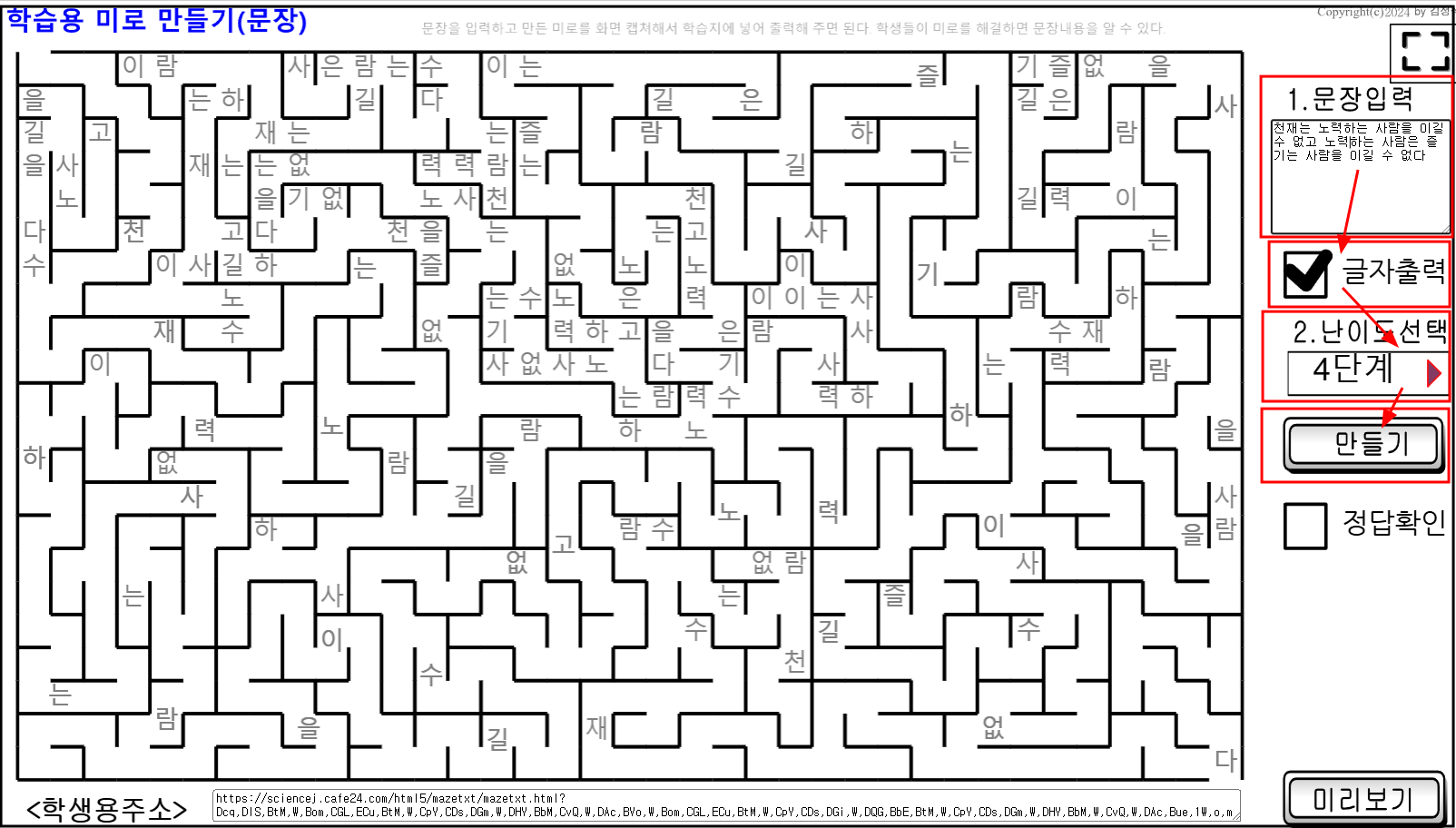 문장입력 칸에 원하는 문장을 입력하고 만들기 버튼을 눌러 학습용 미로를 만든다.