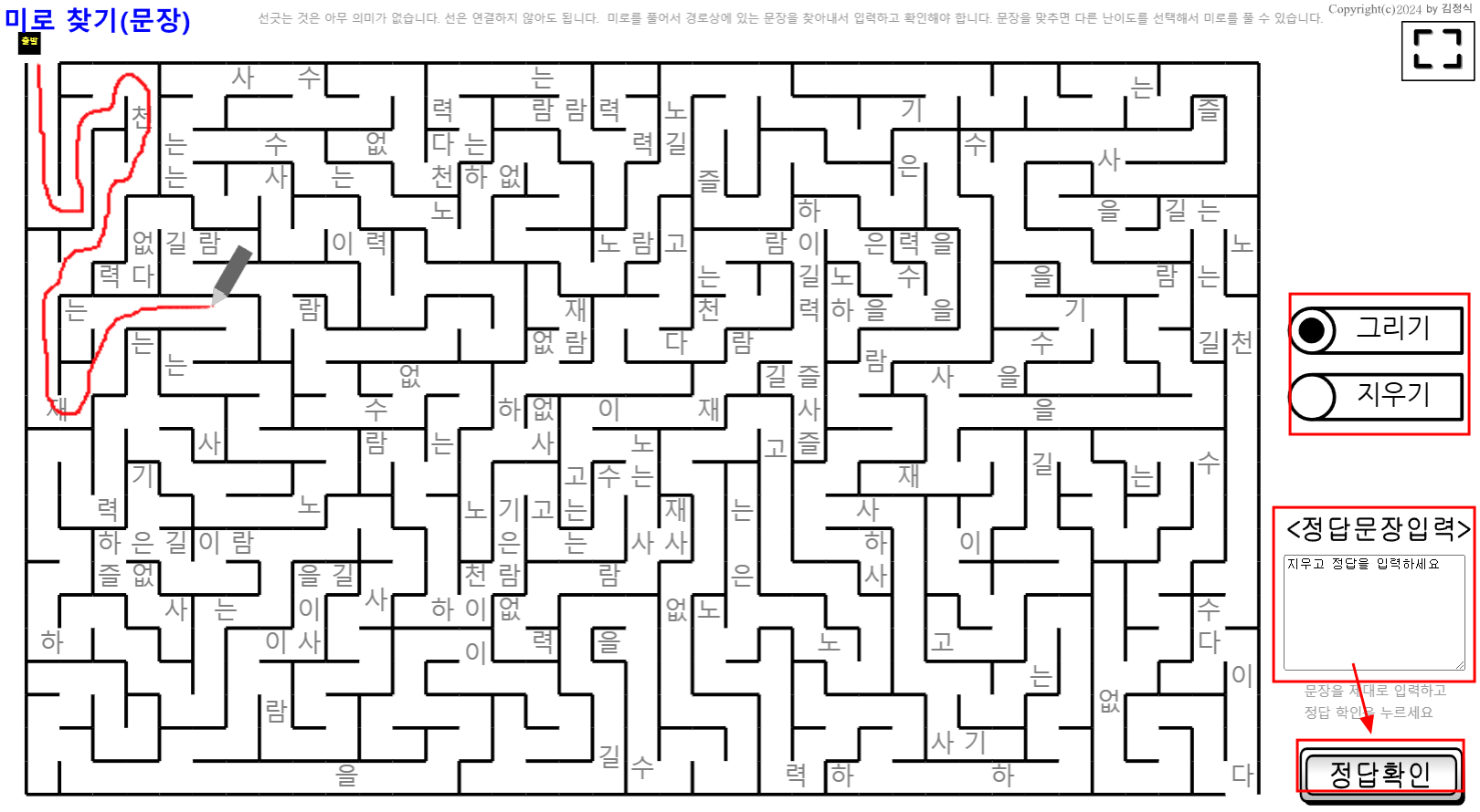 그리기에 체크를 한 상태에서는 화면에 직접 선을 그려가며 미로를 풀 수 있다. 지우기에 체크하면 그린 선을 지우개로 지울 수 있다.