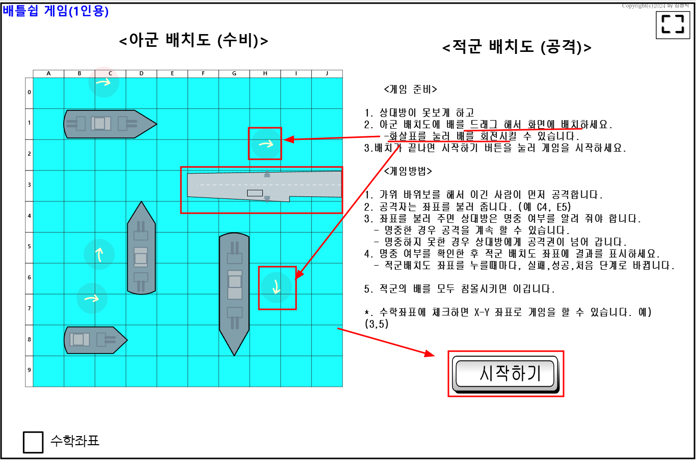 1. 상대방이 아군 배치도를 보면 안된다. 상대방이 보지 못하게 하고 아군 배치도에 배를 드래그 해서 화면에 배치한다.