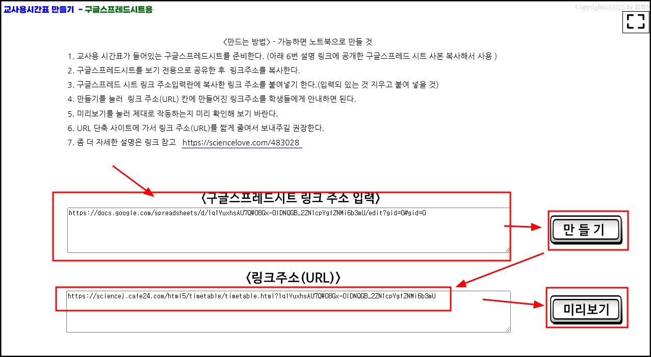 2. 아래 교사용 시간표 만들기 링크에 접속해서 복사한 구글스프레드시트 링크 주소를 붙여 넣기 하고 만들기를 누른다