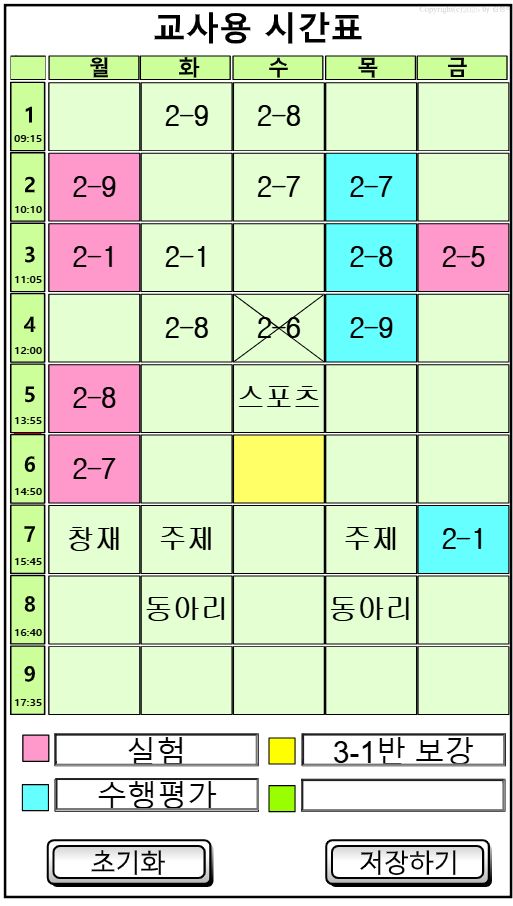 학기초에 교사용 시간표를 한번 만들어 두면 한학기를 사용할 수 있다.