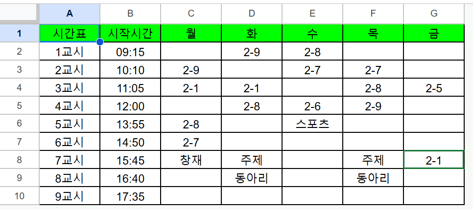 <원본 구글스프레드시트를 사본복사해서 열이나 행을 임의로 삭제하거나 추가하시면 안됩니다. 내용만 바꿔 주세요. 9교시도 남겨 두셔야 합니다.>