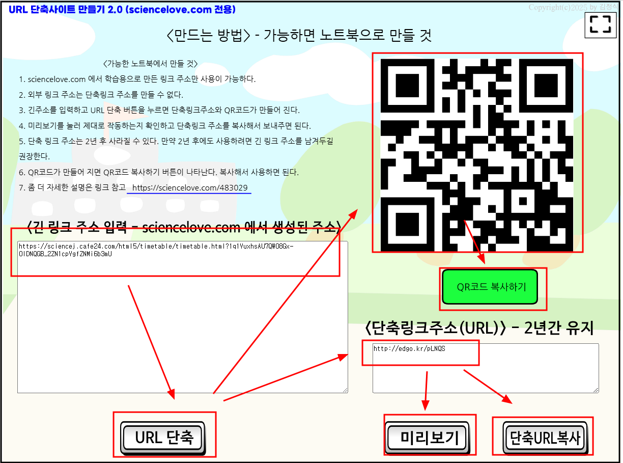 sciencelove.com 에서 만든 교수 학습용 프로그램의 링크 주소를 짧게 줄이고 QR코드를 만들 수 있다.