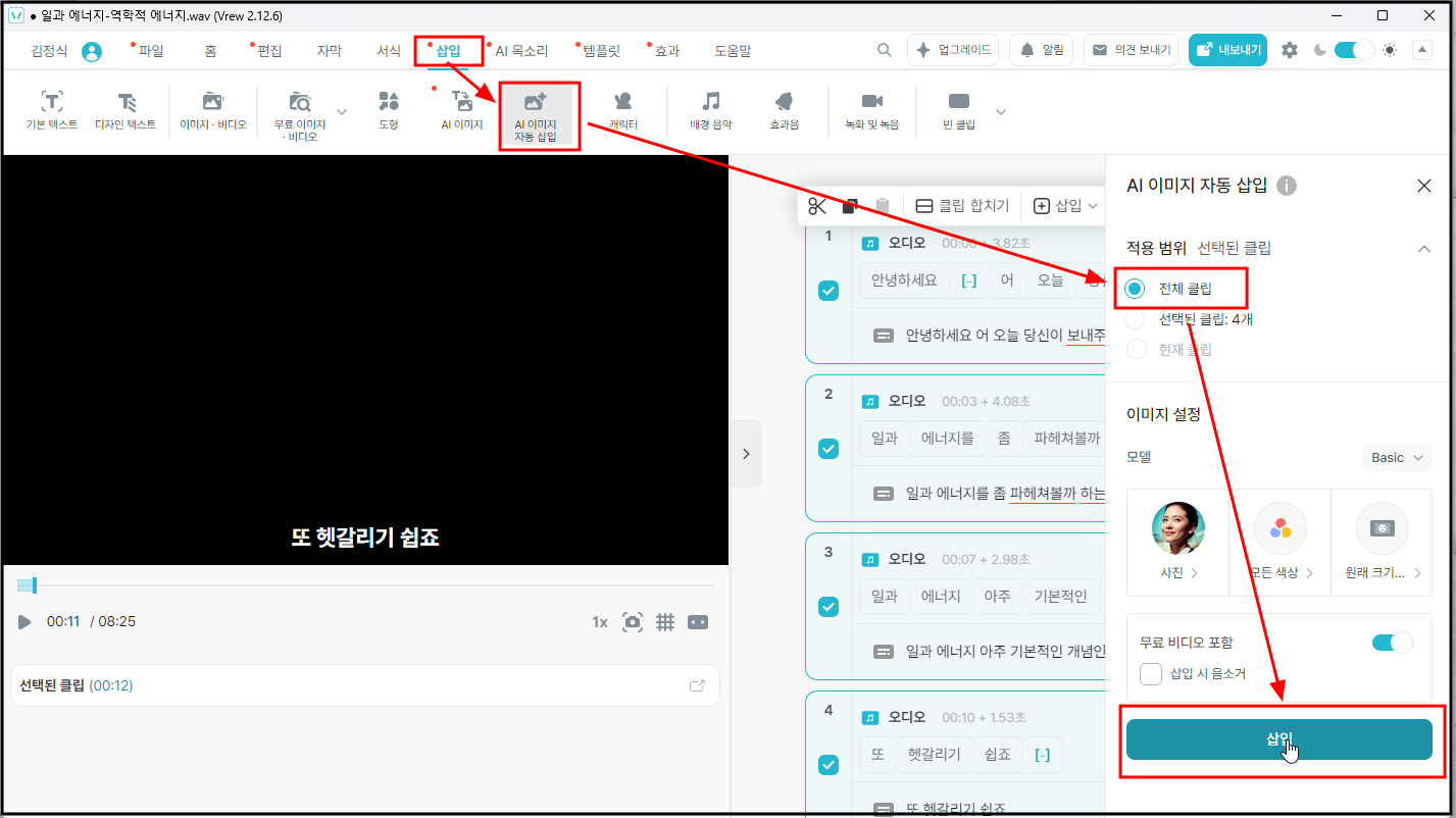 4. 삽입 - AI 이미지 자동삽입 - 전체클립 - 삽입을 눌러 주면 된다.