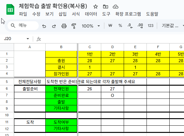 단톡방 공지사항에 주소를 넣어 놓면, 각 반 담임이 출발 준비가 되었는지, 몇명이 아직 오지 않았는지 사안이 발생할 때 마다 기록해 주면, 카톡으로 주고 받지 않아도 확인하고 출발할 수 있지 않을까?