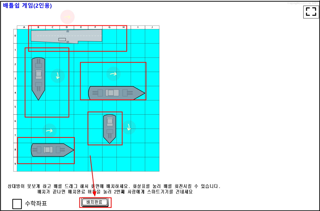 1. 첫번째 참가자는 두번째 참가자가 보지 못하게 하고, 먼저 배를 화면에 배치 한다. (두번째 참가자는 배치하는 화면을 보면 안된다.)