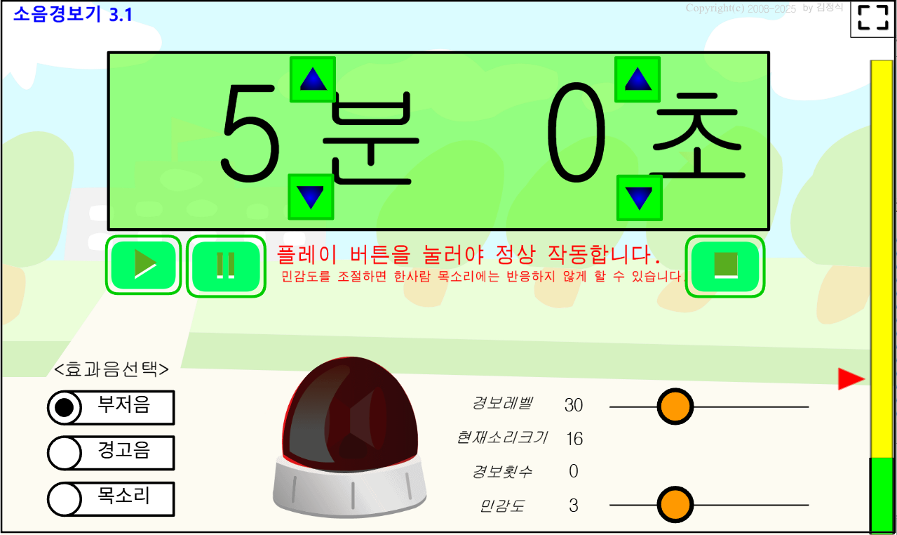 수업시간에 활동시간을 맞추고 재생 버튼을 누르면 소음경보기가 작동한다.