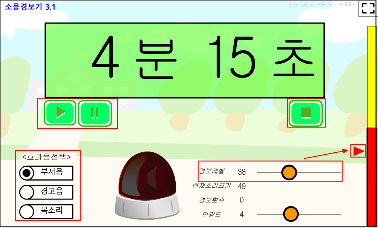 소음경보기3.1로 업그레이드 합니다. 업그레이드 하면서 효과음을 여러개 선택할 수 있도록 수정했고, 소음과 관계없이 언제든지 경고등을 누르면 커다란 경고음이 발생해서 학생들을 집중하게