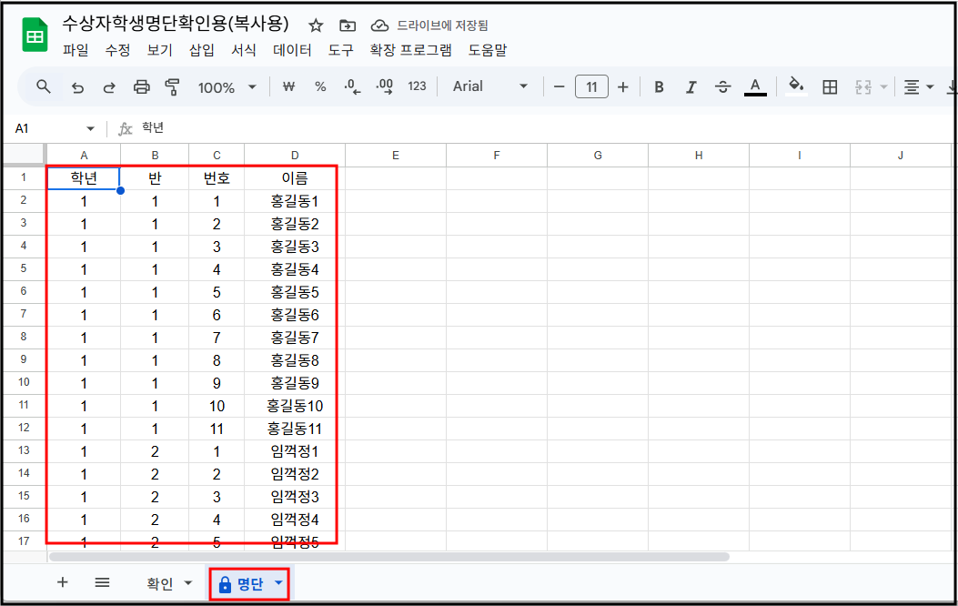 2. 명단 탭에 가서 우리학교 학생들 학년 반 번호 이름을 형식에 맞춰 입력한다.<선행작업 필요-관리자 1명만 하면 됨>