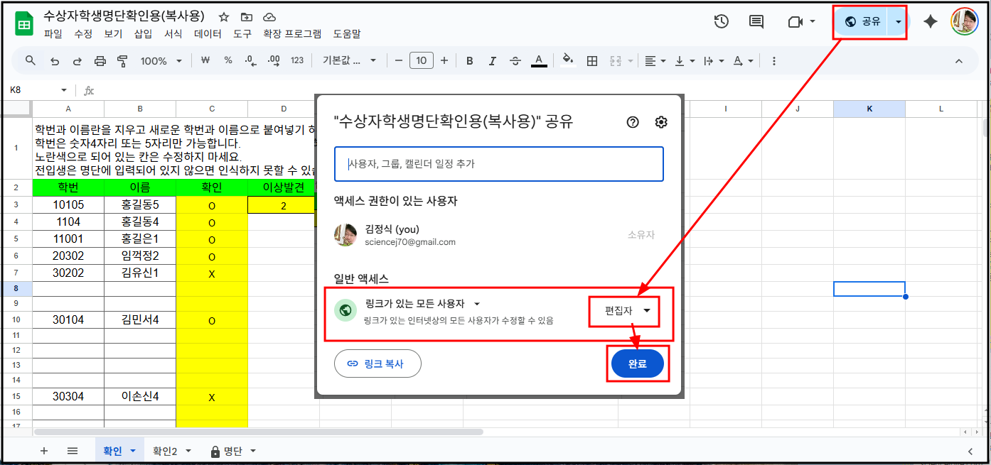 만들어진 구글스프레드시트를 편집자로 공유해서 링크주소를 전체선생님들께 공유한다. 편집자로 공유해야 선생님들이 학번과 이름을 붙여넣기 할 수 있다.